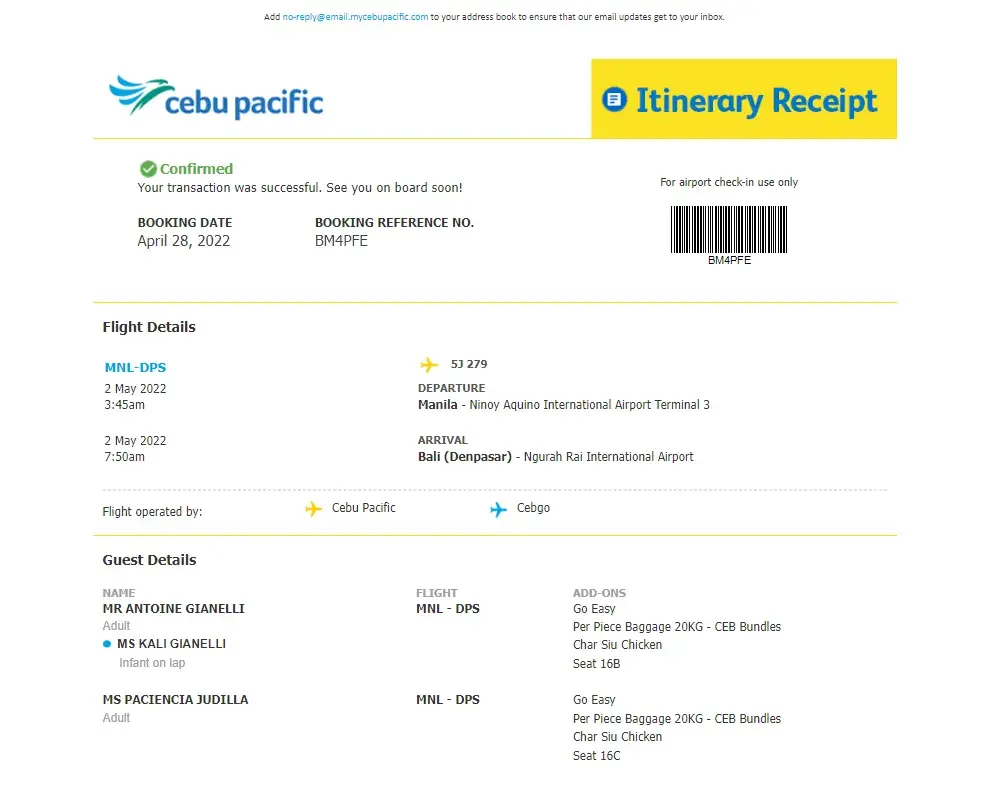 On May 2, 2022 at 3:45am, we - a family of 3 with a 10-month old infant, were supposed to board Cebu Pacific Air flight 5J 279 from NAIA Terminal 3 to Bali, Denpasar Indonesia. We made sure to arrive at the airport with ample amount of time to make space for unpredictable circumstances or troubles, as unfortunately that is the reputation of Philippine airlines and airports. We arrived at more or less about half past one, headed to the check in area at the end of the hall and queued, despite carrying a child while standing on queue, no one offered to accommodate us or give us priority to check in which is common practice on boarding planes but apparently not on checking in. When it was finally our turn, I handed the following: 3 passports, 2 valid RT PCR negative test results, 2 vaccination cards and showed both our PeduliLindungi mobile applications - to the Cebu Pacific staff member, Kristine Bulawan. She weighed and checked in our luggage and printed our boarding passes but put us on hold until the last hour - everyone had already gone to the boarding gate except us. Her trouble was that, she did not know for sure whether or not, my 10-month old baby was required to be swab tested, vaccinated and registered to the PeduliLindungi mobile application so she decided to call their outpost in Bali to get verification at the expense of our time. I believe that nobody had ever answered her query and she knew time was running out, so she decided to give us our boarding passes and our waiting had been for nothing, she even assured us that we were going to be fine as she already checked us in. We rushed to the immigration where we encountered another trouble which consumed the rest of the little time Kristine had left us to be able to reach the gate. The boarding control personnel walked to the immigration officer’s cubicle and they had informed us that despite the immigration finally granting us passage, at that time, it was the airline denying us to board as it was too late. We had never heard any public announcements calling out our names for final boarding. We could not do anything else, so we headed out and tried to retrieve our luggage so we could go home and rest but unfortunately, we were made to wait by Cebu Pacific Air once again - for as simple as baggage retrieval. I do not know if there is any standard procedure in place for offloaded passengers but it sure felt and looked like there was none, and if there ever was, it was most certainly not designed for our convenience, but the complete opposite. Our supposed fight had left at 3:45am, we had exited the doors of NAIA Terminal 3 at about 7:12am. All that time in between we had spent waiting in aggravation. We were told to wait again and again because it took them so much time to locate and bring up our luggage. When I had spoken to the OIC present at that time from Cebu Pacific Air, I asked to speak to a manager but no one had any time to hear us out so I had told her our experience and frustration, I heard her apologize over and over again but I looked into her eyes and I could not see genuine concern. She had also mentioned that it was their first non-stop flight from Manila to Bali again since the pandemic and that only further proved the lack of preparedness and knowledge regarding restrictions and requirements on their end. I am writing here because I, along with my family and all the other Filipino citizens and foreigners who have had horrible experiences because of your incompetence and inefficiency deserve justice and better service from better qualified individuals. I cannot accept that this is how our airlines in the Philippines operate and deal with paying consumers. I am hoping that through this complaint, there will be a record of your incompetence. We had lost about 45,000 Philippine Pesos which includes our RT PCR tests, flight tickets and reservations in Bali, because of your unpreparedness, complacency, and inadequacy to appropriately and efficiently operate the check in procedure of that flight. We had been stressed, hassled and as far as I am concerned, neglected by Cebu Pacific Air. We had not only lost money but had also lost time, effort and confidence – not only to the staff members of Cebu Pacific Air but the integrity of the whole airport operation.
