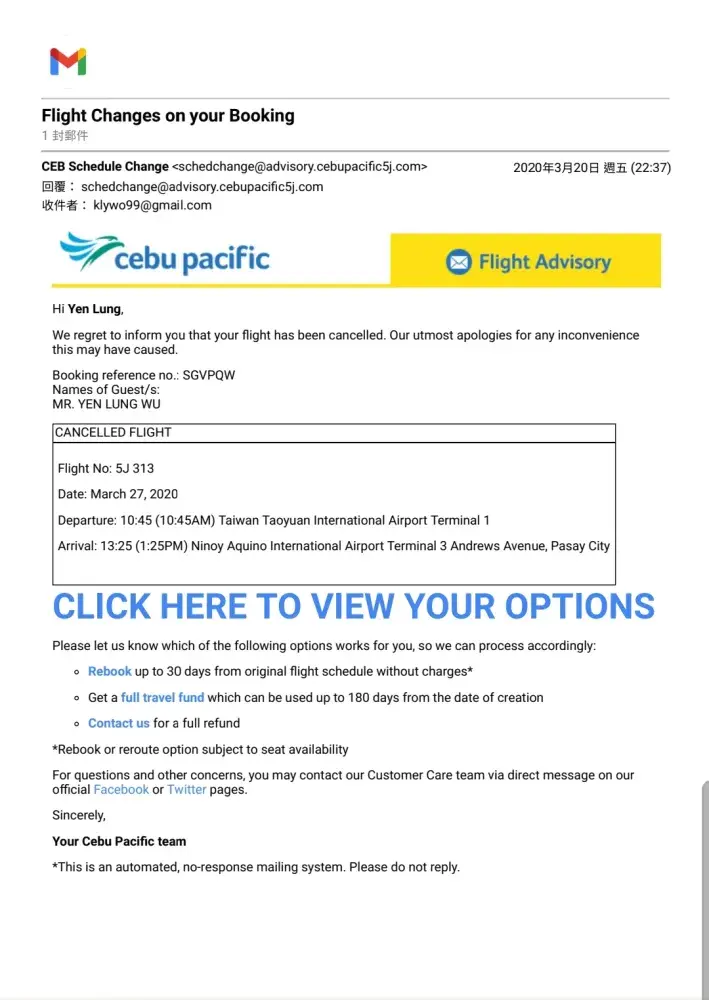 I claimed to refund my flight cancel due to covid19, flight No:SGVPQW, but no response, no refund, and the contact email:[protected]@cebupacificair.com did unacceptable manner with irresponsibilitu really annoyed me, no response, no refund until now.