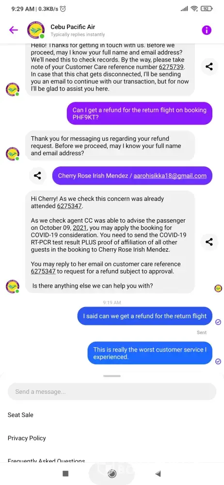 Worst customer service ever. Last night I did seek help from their CS via messenger chat because we've missed our flight yesterday due to pandemic reasons. The agent who's name CC did not get back to me, not even properly ended the chat. Same with James whom I chatted today. I am only asking if we can have the return flight be refunded and yet they're giving me hard time. Worst and unprofessional customer service.