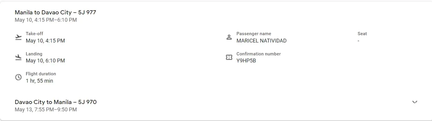Flight date/time: MANILA TERMINAL 3 TO DAVAO, JUNE 24, 2022 Cebu Pacific 5J-979 Dep. 13:35 Arr. 15:30