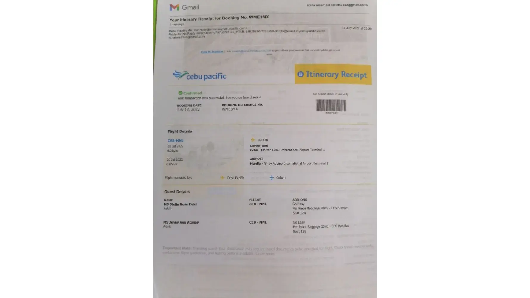 Flight date/time: MANILA TERMINAL 3 TO DAVAO, JUNE 24, 2022 CEBU PACIFIC 5J-979 Dep. 13:35 Arr. 15:30