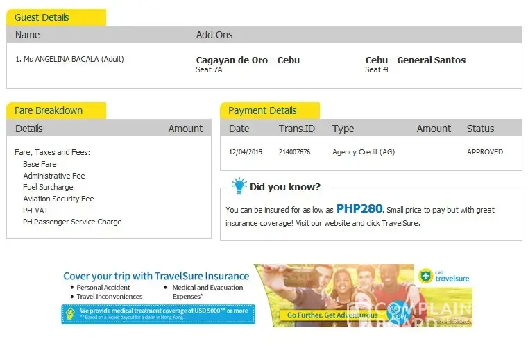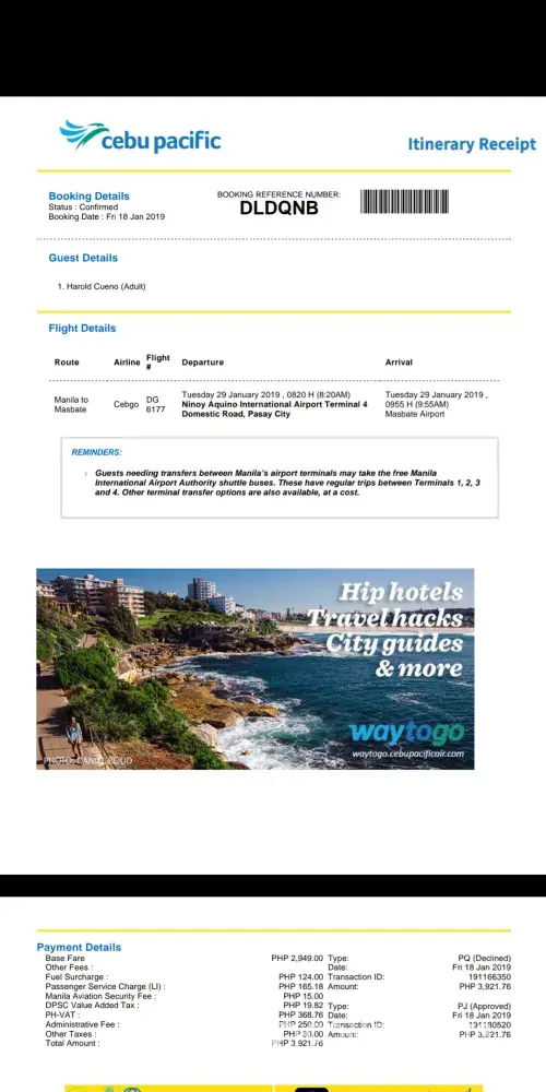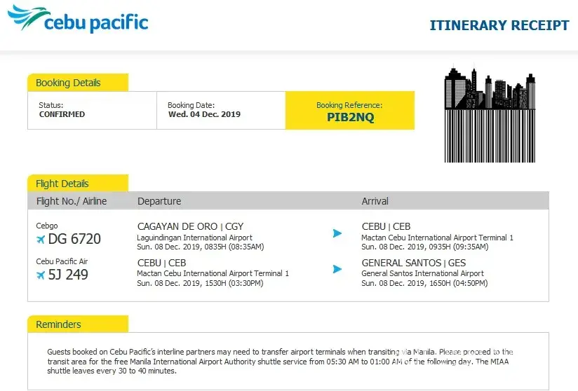 Route: Puerto Princesa( March 28, 2019 10:00AM) to Manila (11:30AM) Flight 5J 638; Manila (March 28, 2019 3:25PM) to Legazpi (March 28, 2019 4:40PM)Flight 5J 329