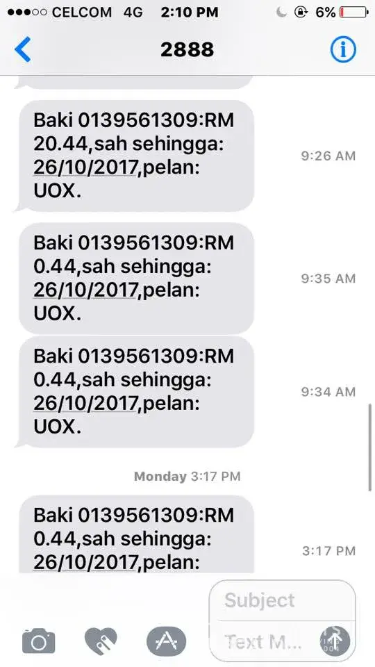 pada jam 9.26 am, saya periksa kredit saya sekali lagi dan ia masih rm20.44. dan pada jam 9.33, saya mendapat mesej dari celcom mengatakan langganan internet mingguan saya telah berjaya. pada jam 9.34, sekali lagi saya menerima mesej yang sama. kemudian, saya periksa kredit saya paada jam 9.34 dan 9.35 am, dan ianya berbaki rm0.44 sedangkan saya tidak membuat sebarang penggunaan kredit. di sini saya kehilangan rm10.
