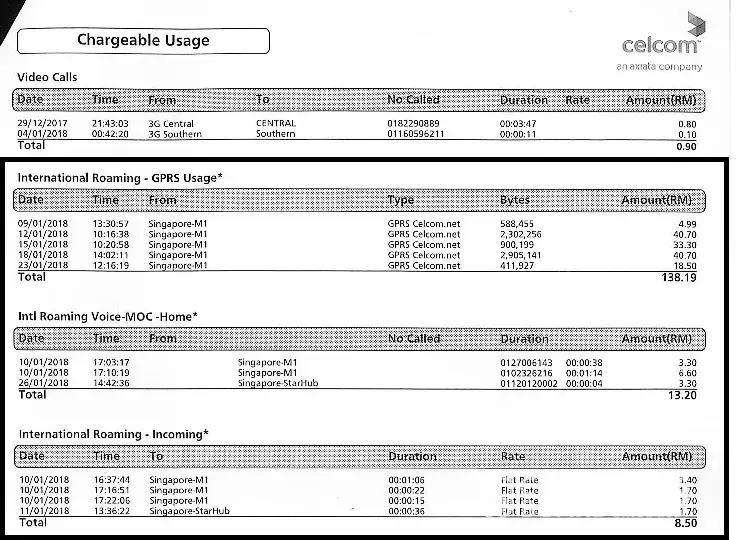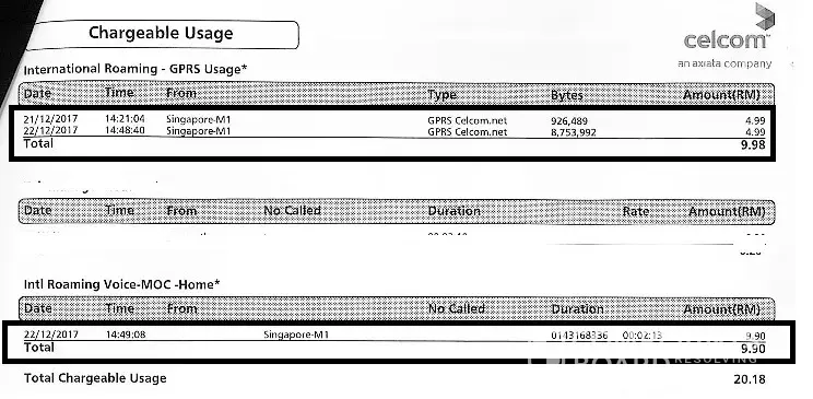 The charges are unwarranted and baseless because these charges are imposed while I am in Johor Bahru and I did not travel to Singapore at that time. The data-roaming setting on my phone is always switched off. I have forwarded my complaint letter with my passport copies to support my claim. However, CELCOM dismiss my complaint even it is beyond reasonable doubt that I am not in overseas at that time. The answer I get from the customer service agent is that the charges are valid.
