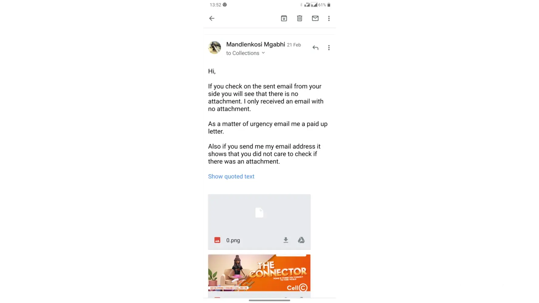 Since November 2021 i have been sent from pillar to post & not being furnished with a paid up letter. In January 2022 i received an email saying they have attached a paid up letter but there was no attachment on the email. I have called customer care & cases being logged but i seem not to be receiving meaningful assistance from cell c