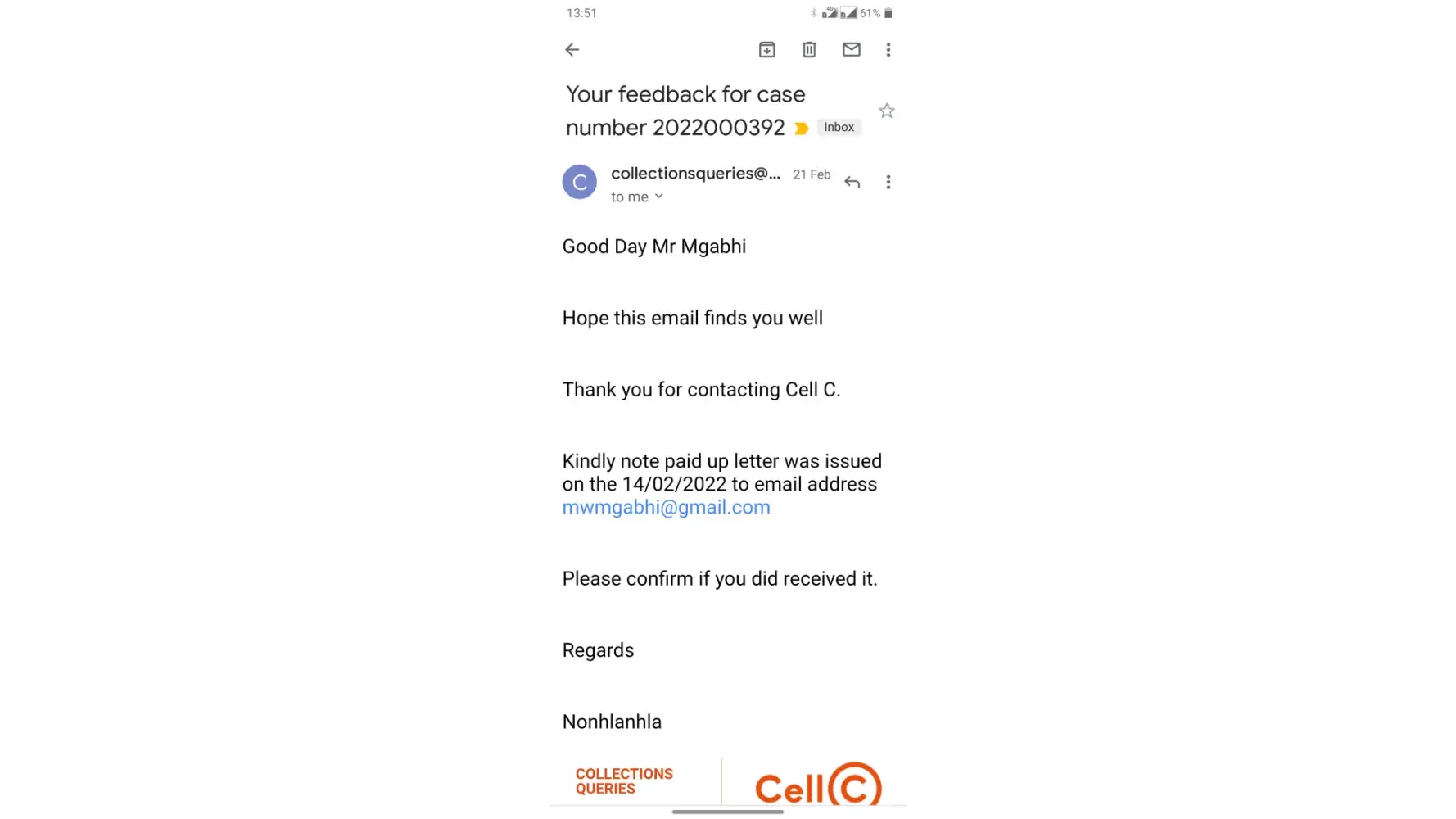 I would like to resolve this issue soon because I'm not gonna pay Cell C any monies.