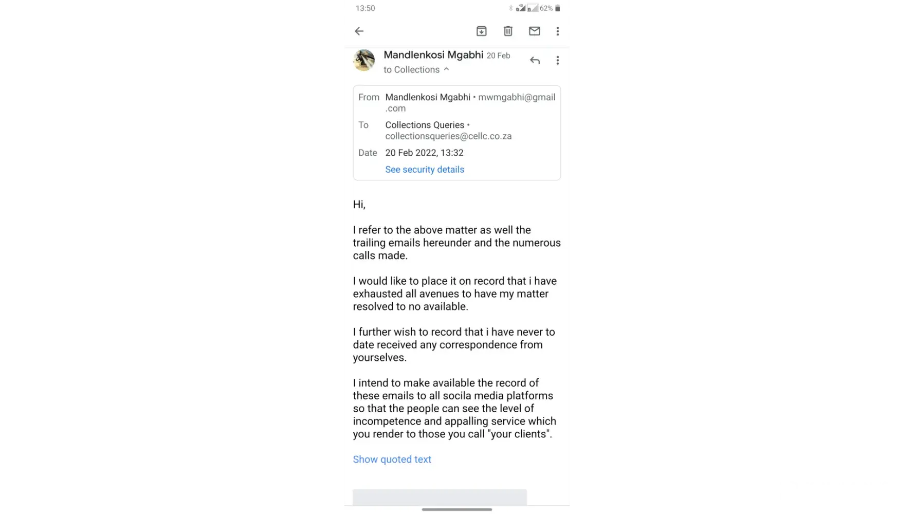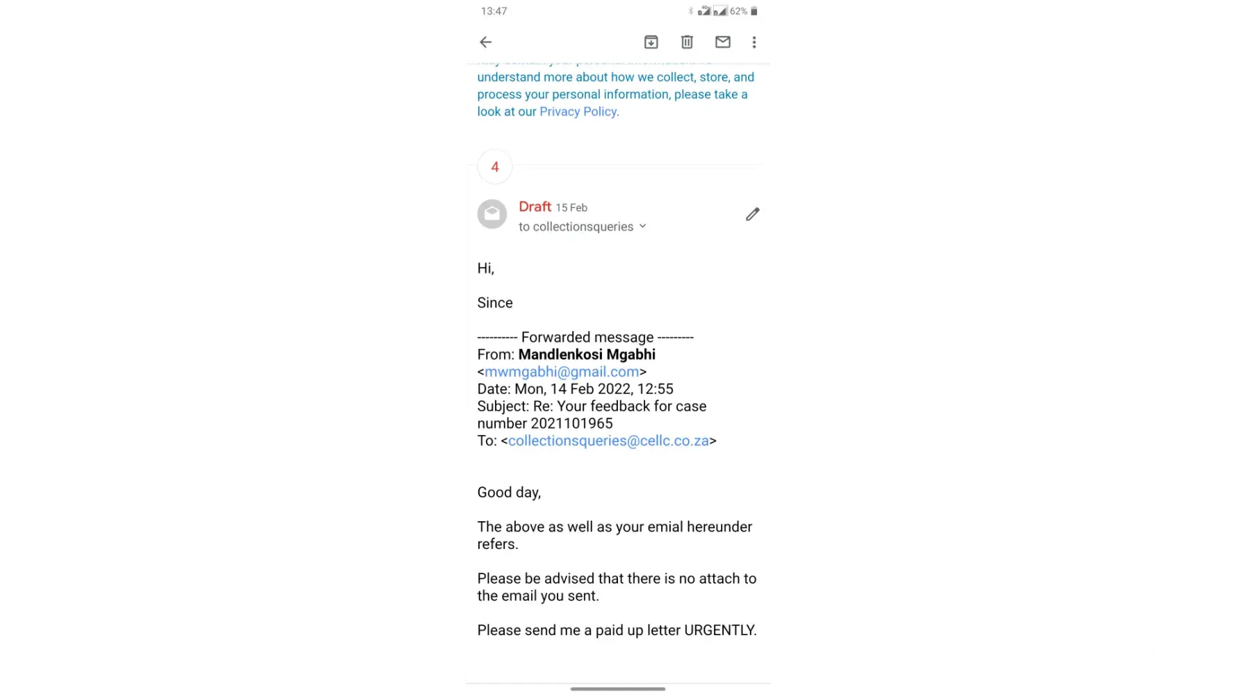 Since then, I pay my monthly account, but for the past month or so, I started getting SMS's saying that my account is in arrears and that I should make at least a minimum payment of R100. Now I'm confused, as I've been doing my part and paying my account. After numerous emails to Cell C, debt collection agency etc., I get a statement which says I'm over R5000 in credit...confusion right? I request a paid-up letter and I never receive one. You can plead, threaten, yell until you're blue in the face - NOTHING.