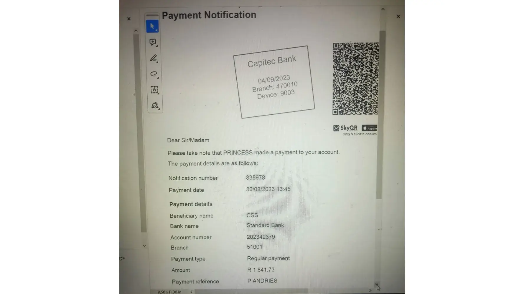 I receive an email on the 7th of July 2023 from CSS tailor made solutions requesting payment of R557.95 . Amount of R600 was paid in R100 installment.