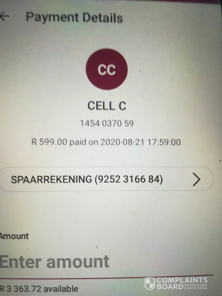 I have done an eft on the 17th showed all my bank statements stating it was done by eft inetbank payment. On the 22nd cell c did debit again after I phoned on the 10th saying money will only be in on the 17th. So I reversed it on the 24th.