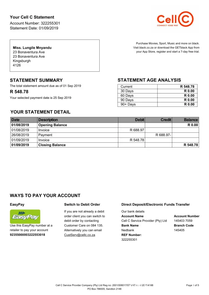 This email serves as a complaint to Cell C collection/billing department, I have an account that I opened on the 04 January 2020 and axactly on the 15 July 2020 there insufficient funds on my bank account in order for the debit order to go through and I did pay my cell c account an amount of R 448.00 via EFT service using my banking app on the 17 July 20 to this CELL C BANKING DETAILS :