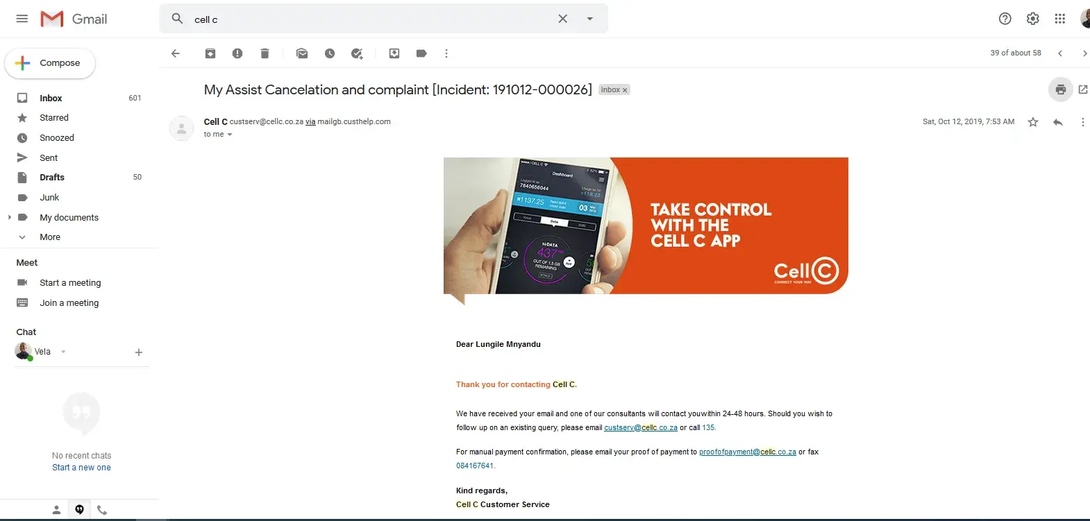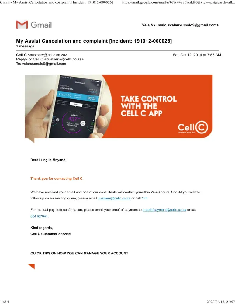 Since well you (Cell C) can not stick to your own time frames am giving you 14 days counting from the 23 JULY 2020 to resolve my matter because that is the day and date I brought this matter to your attention my case number/reference no is [protected] and [protected] failure to do as I instruct, like wise its unfortunate I will be forced to lodge a complaint against you to the Independent Communications Authority of South Africa with the assistance of my legal team to combat and resolve this matter.