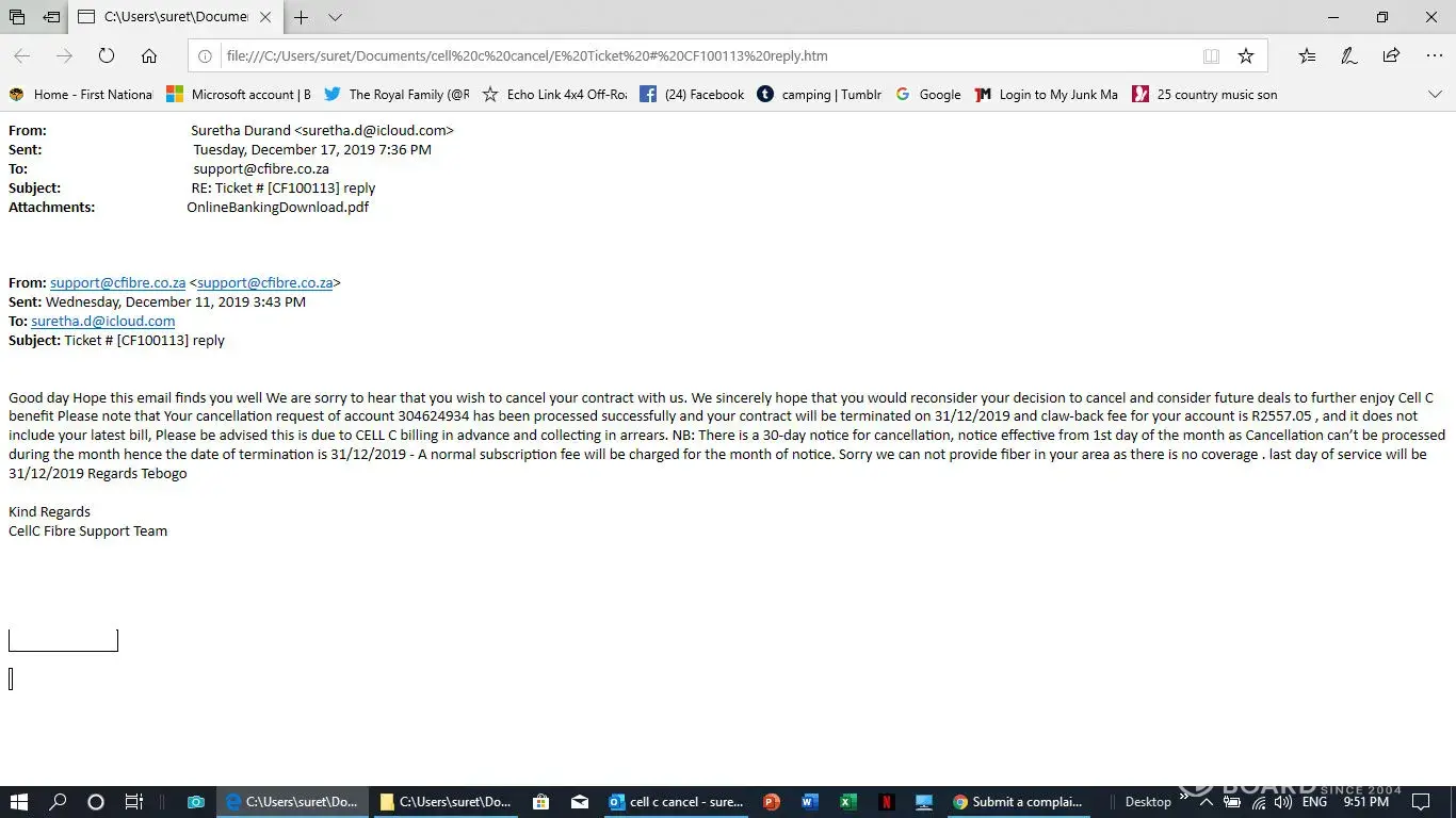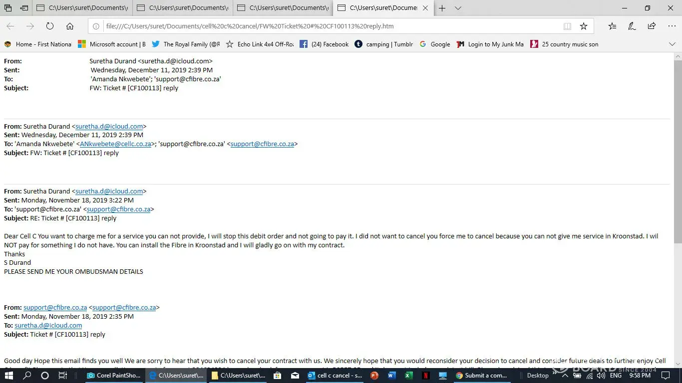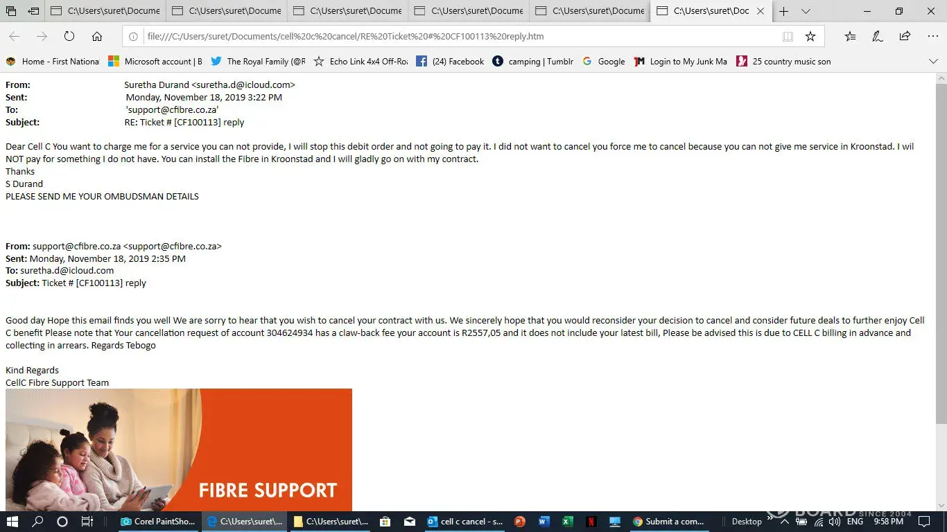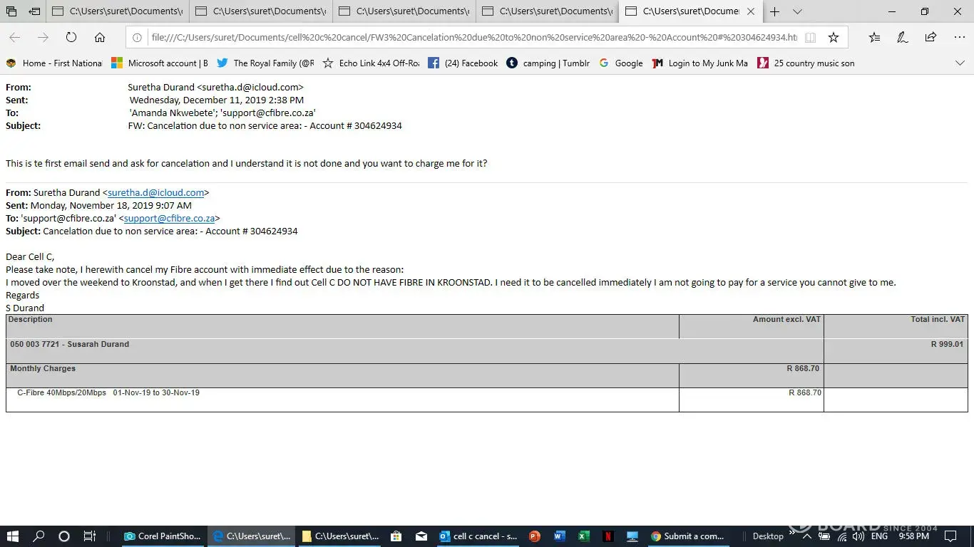 I have a contract with them but fell ill and move then to Kroonstad to be near my doughter and the doctor. Kroonstad do not have Cell C Fibre they can not give me service but they keep on charging me for a cervice they can not deliver. On the 18the November I send them a email for cancelation but it is not done. Herewith all email I send to them. PLEAQSE help in this regard, I do not help to talk to tehm