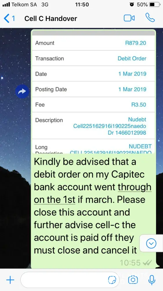 My name: Eunice Peggy Xolisa Tauo. Cell c account number: [protected]. I had a contract with cell c I was paying well till when I lost my job. They sent NUDEBT to collect the outstanding and and they had closed the number due to non payment. 1st of March 2019 a debit order went through paying cell c the outstanding amount of R879.20 was paid in full. 30th of March I see the statement showing I owe R1149.14. I advise and sent proof that this money was paid before they included whatever amount they felt like. Now cell c keeps on debit my bank account don't know for what and now because of their incompetence this is starting to affect my credit score I want this sorted out because I don't owe cell c any money