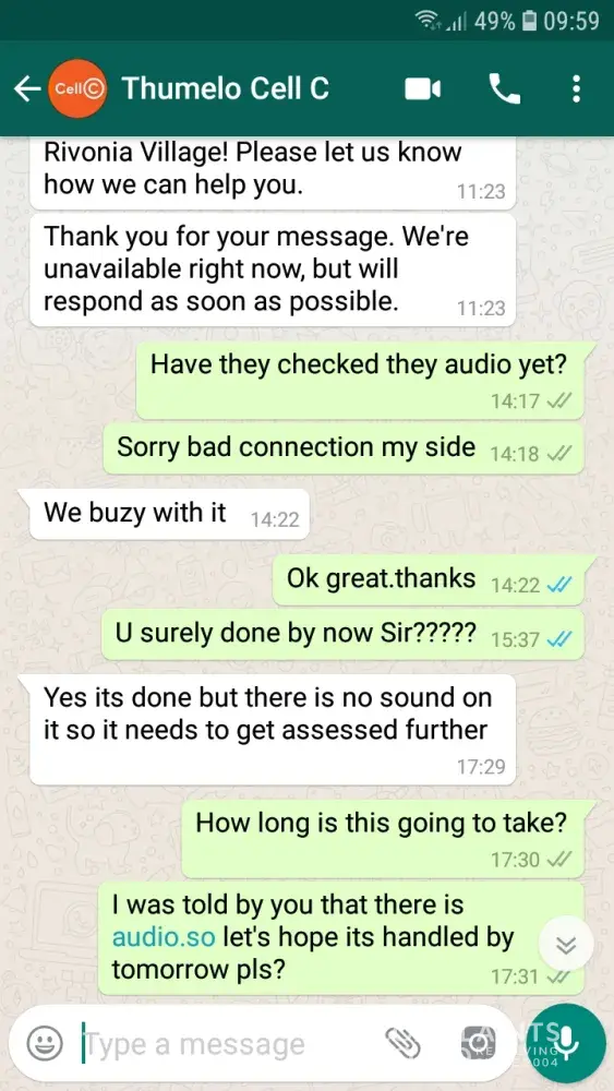 [09/16, 11:23] thumelo cell c: thank you for contacting cell c rivonia village! Please let us know how we can help you.