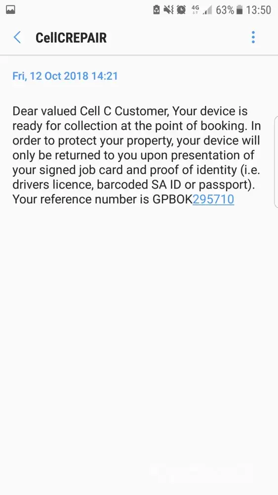 I received an SMS from the repair centre on the 12th of October to advise me that my phone was back at the place I booked it in for repairs which was Cell C East Rand Mall.