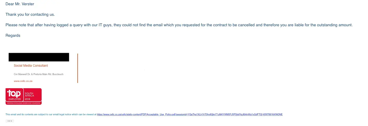 All I need to know is how do I solve this matter and cancel the bloody contract because i can't work with people who steal my father's money and see nothing wrong with that. It's been 15 months since I took this contract and have already paid R5819.85 again cell c have gained an extra R520.85 from scamming a person who is bed ridden and cannot fix this matter themselves.
