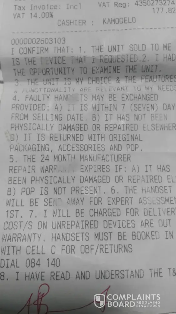 We handed in my Hurricane Blast for repairs at Ackermans on the 9th May 2018. We were informed by Cell C repairs department that our warranty has expired. My tax invoice indicate that I have a 24 month manufacturer warranty. I purchased the tablet on the 12th April 2017. The Cell C repair department said that I must take this up with Ackermans because they only have a 12 month warranty.