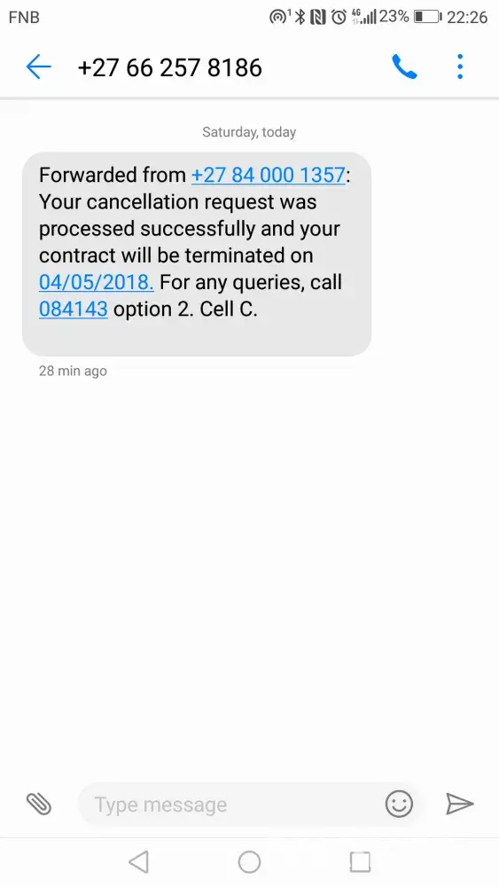 I contacted Cell C on the 4th of April 2018 to inform them that I am cancelling my contract/s with them. They then also sent me a confirmation SMS to inform me that my request has been received and that my contract/s will be terminated on the 4th of May 2018.