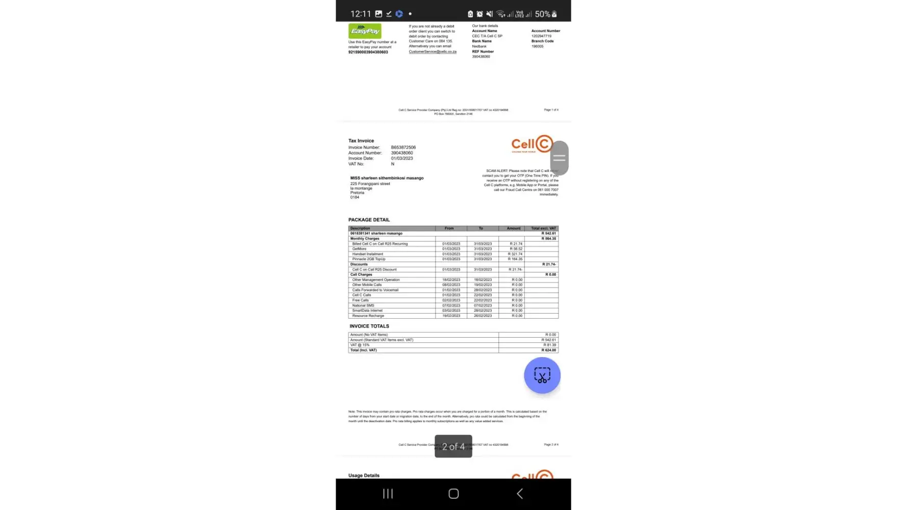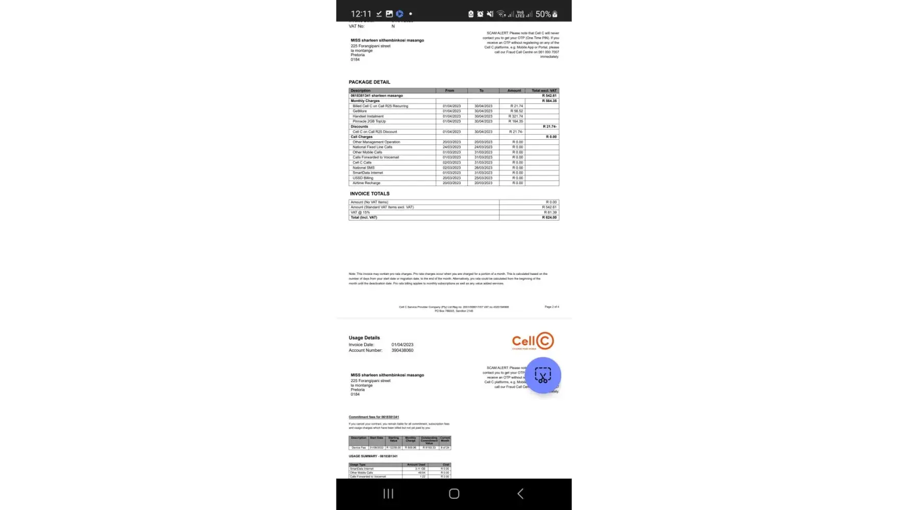 The one from Cell C with a statement where R2292 was added s well as R70 for not honoring payment arrangement, but I did keep to arrangement payment was made on the 31st, so new balance of R2871.