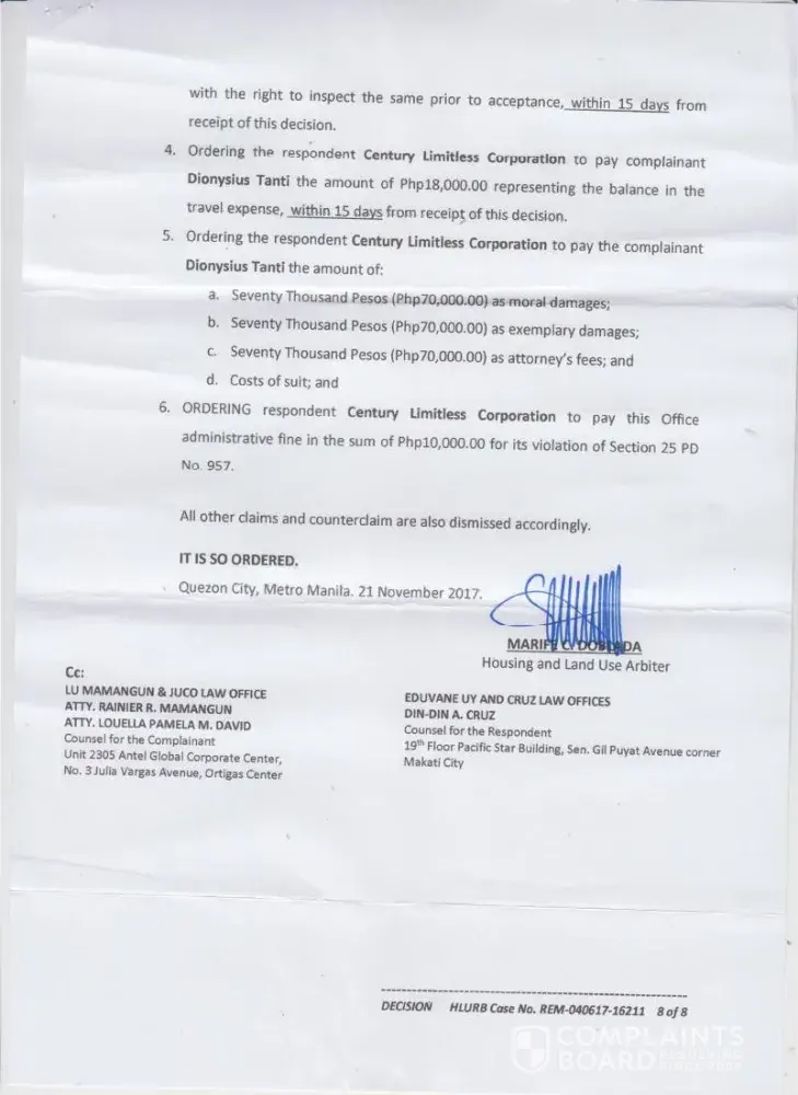 I had therefore instituted a case before the Housing and Land Use Regulatory Board against Century about the delay in the turning over of my Unit and the lack of fulfillment of its obligation to deliver its title to me. This costed me hundreds of thousands of pesos in attorney’s and other fees.