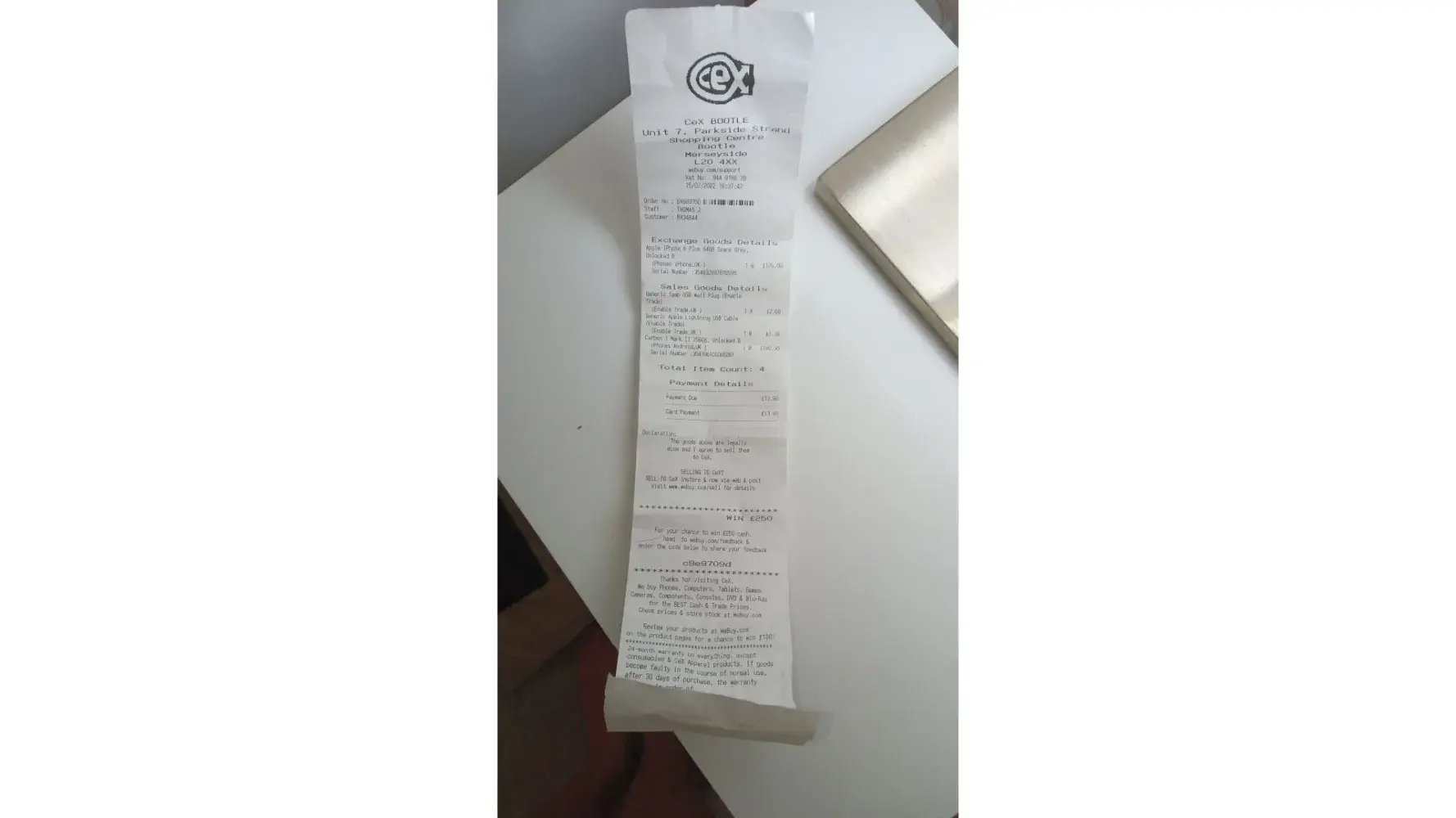 My name is Liam Crilly I purchased a mobile phone on the 15.02.2022 only 9 days ago, so I went into the store in Bootle strand with the phone complaining about the speaker is low and can't here the the phone when playing voice calls, so they looked at it and said that the warranty is void due to a slight lift to the screen which I was not aware of this issue iv been a valuable customer to your company and am not after a refund , I would appreciate if you can issue a credit note as I paid £180.00 for faulty goods the phone I purchased was a carbon 1 mark 256 GB B grade serial number [protected]