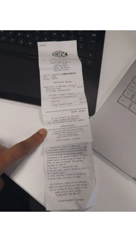 Fault developed in right earbud within 2/3 days and returned on the 27th June 22 (Grade A product - should have been tested thoroughly) returned the item to the Bolton store, which is near my place of work. Advised it would be subject to a 10-15 minute test. I returned after 20 minutes, advised it was indeed faulty and replacement or refund available. I opted for a replacement as i liked the headphones, in a different colour as they didn't have same colour. Took them a further 20 minutes to find the headphones, processed the exchange and was emailed a receipt (or so I was told)