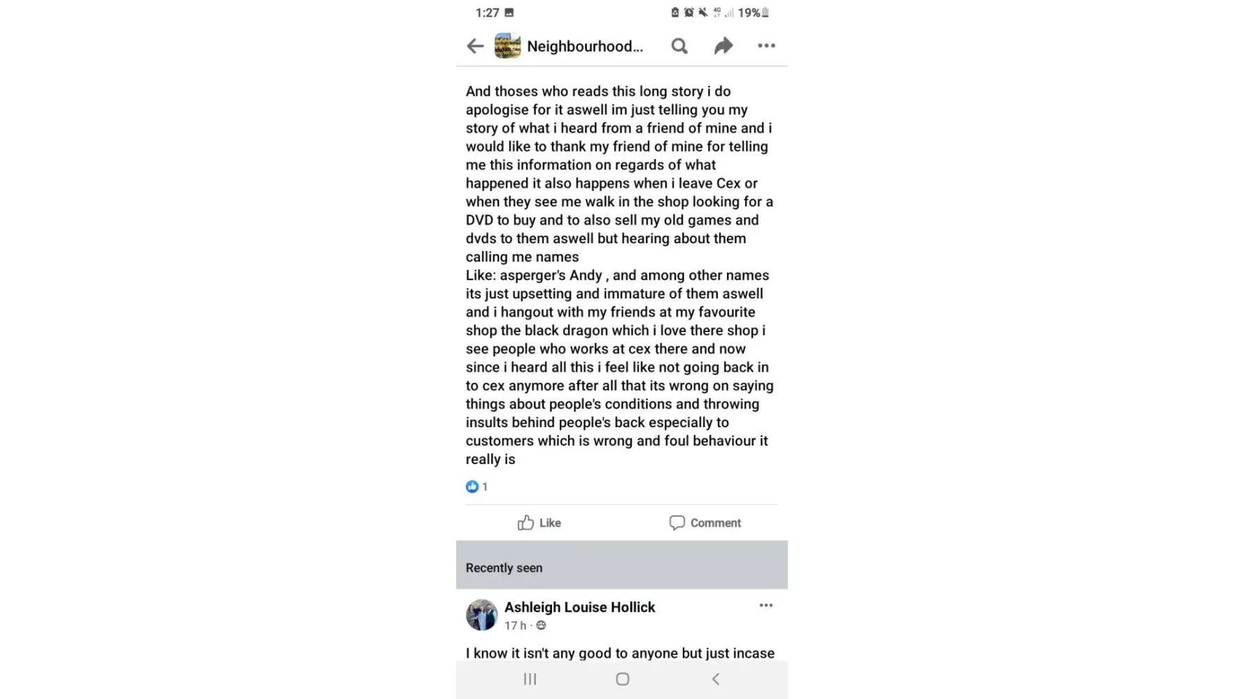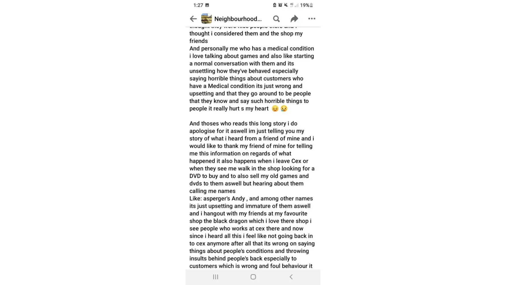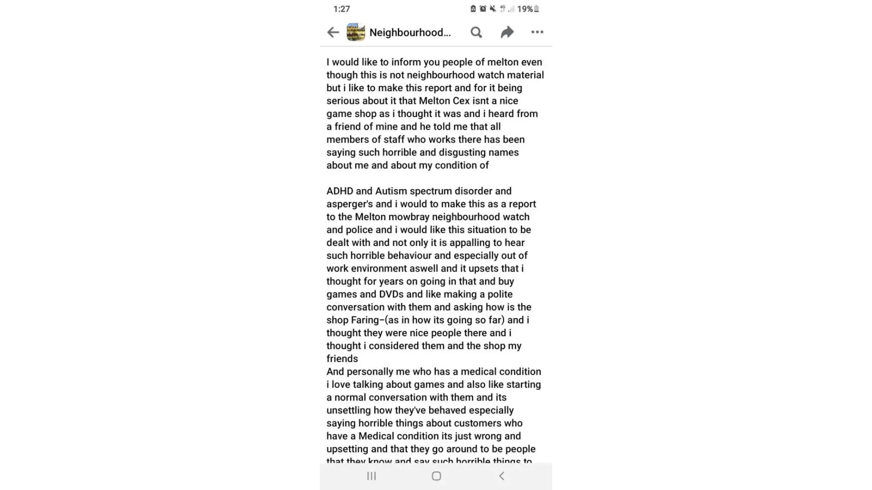 I would to make statement about your members of staff has been saying horrible names behind my back throwing insults about me behind and calling me end i quote "asperger's Andy " which is insult of my condition of ADHD and Autism spectrum disorder and asperger's and it was in Melton mowbray Cex game shop and i would like this matter to be dealt with