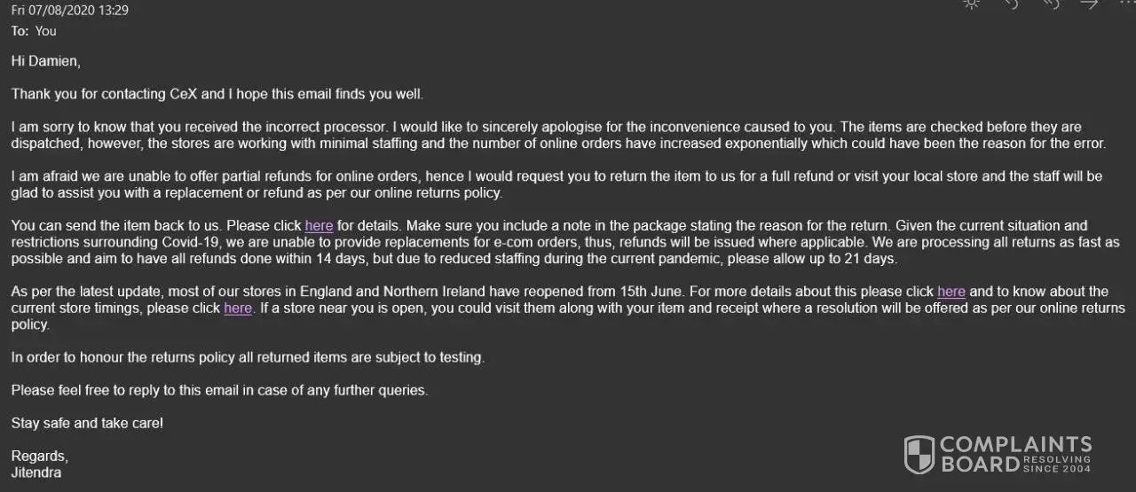 I disputed with paypal and CeX took almost a month to reply, after two messages repeating my past issues paypal have sided with CeX and are forcing me to return not only the CPU I bought but the ram that I bought which was fine.