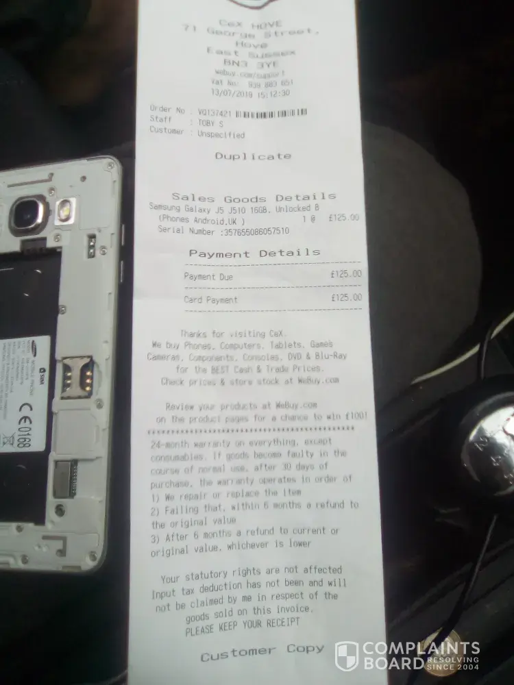 • I recently purchased a phone from your Hemel Hempstead store on the 13th July, this phone was an iPhone 5c in blue and was £70. I had lost my phone the previous night so I went straight to cex to purchase a new phone and found this one straight away. The lady that served up was very polite and patient as we asked questions about the phone. The phone looked in good condition so I took the phone home in my girlfriends bag and by the time I got home I took the phone out and the top right hand side of the screen had popped out so the following day i took the phone back down with the receipt and explained what happened only to be told by the supervisor who was visibly nervous and shaking making me feel very uncomfortable, that there's nothing he could do due to the phone being in working order when passed over the counter. He then went on to say we have checked the cameras and the phone wasn't popped out when it was purchased which is correct but not once did I say that it was. I have said the phone looked in good condition or I wouldn't have purchased it. This then made me feel embarrassed and belittled in front of customers as he was accusing me of saying the phone was already broken. There is nothing I could have done about the screen popping out whilst it was in my bag. 24 month warrenty and I didn't even have the phone for 24 hours and spent 70 pound that I did not have because I needed a phone and I always use cex to trade my games and buy games so I thought it was reliable. I then had to go and buy a phone case to protect the screen so it didn't get more damage. I got told to email customer services and to leave the store without a replacement or refund. Over the past 2 days I have now realised that the phone gets to around 40% and the battery dies so a thorough check hasn't been done on the phone before taking my money. This is not acceptable these faults are none of my own and I now have a phone that the screen is dangerous and could come off at any time and a battery that dies with 40% left. Again none of this was said to me before my purchase or I would have chosen a different phone. I was. Willing to take a replacement on the day but after the shocking and disgusting way I've Neen treated as a loyal customer I want a full refund as the phone is not working to the standard I was promised as the buyer. Thank you for your time and I hope to hear back from you as soon as possible to resolve this issue.