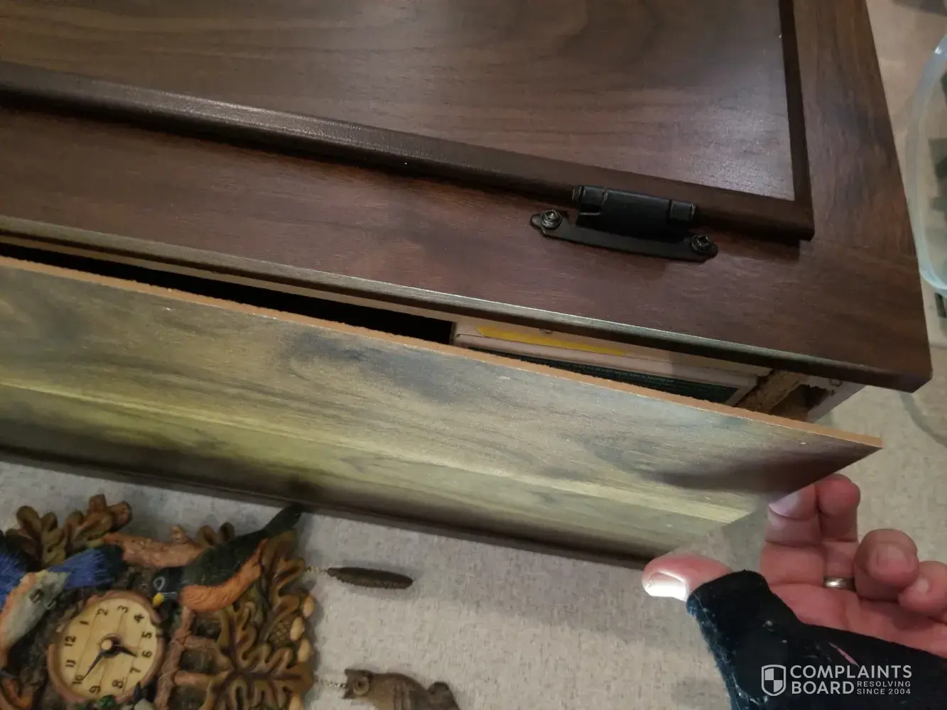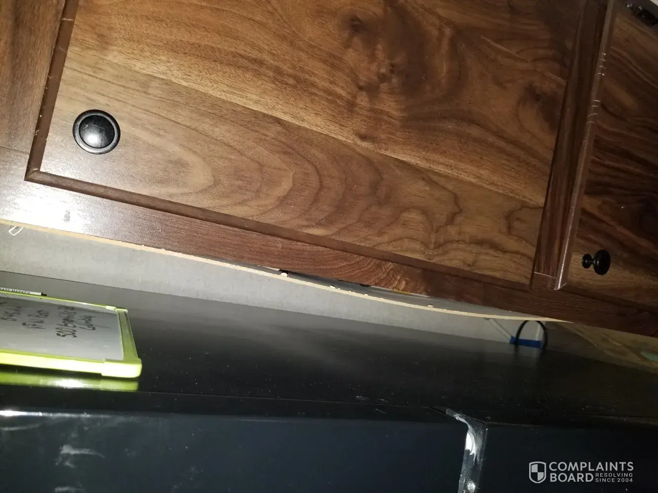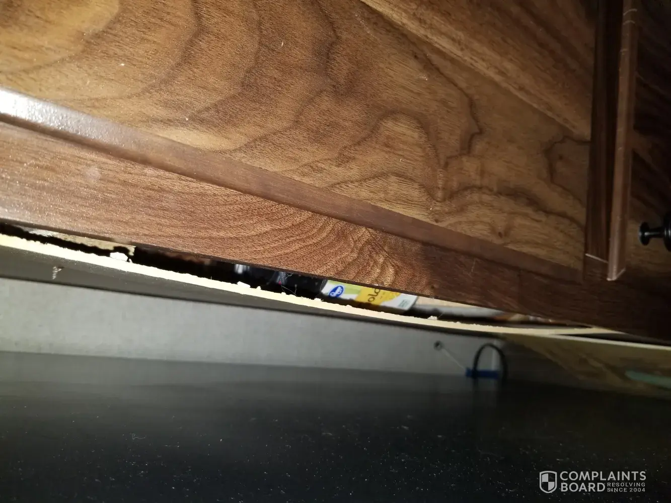 Teresa is trying to state why my kitchen sink is knocking, she doesn't know, the technician said it was air in the pipes but it's more. They think changing the faucet was good enough, that has nothing to do with it. They’re is still creaking in the floors and they aren't going to address those. The cabinets they replaced were done badly, there is a middle piece of wood between the doors and it should be inset and it's not so the cabinets stick out and it's scratched by the screws.