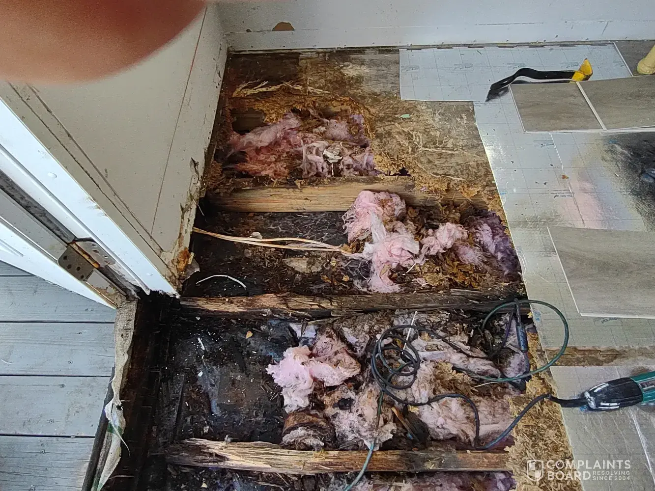 Desired outcome: Complete repair of improperly hung exterior door, and water damage. Replacement of entire home compressed wood underfloor floor