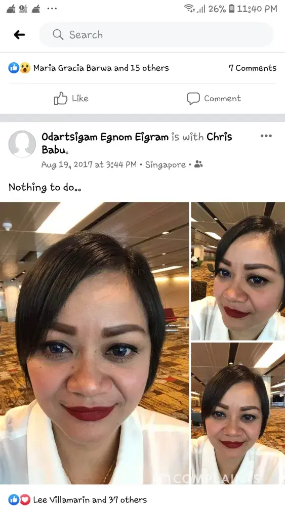 Kindly check your staffs/employees credibility. There are more deserving people to choose. I am writing this complain regarding your staff. MARGIE MAGISTRADO. Doing illegal things and extort money from her Singaporean Friend. She is a prostitute. And check her diploma if theres any. Even secondary highscholl she didnt finish it. Only elementary. How come she passed to changis requirements? If that was so easy to hire an illegal person. How come chnagi rated best airline?