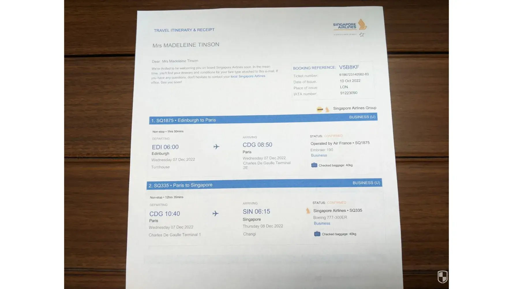 Flights Ednburgh to Paris CDG Air France SQ1875 (AF1887) Terminal 2 to connect with Singapore Airlines SQ335 Terminal 1 to Singapore.
