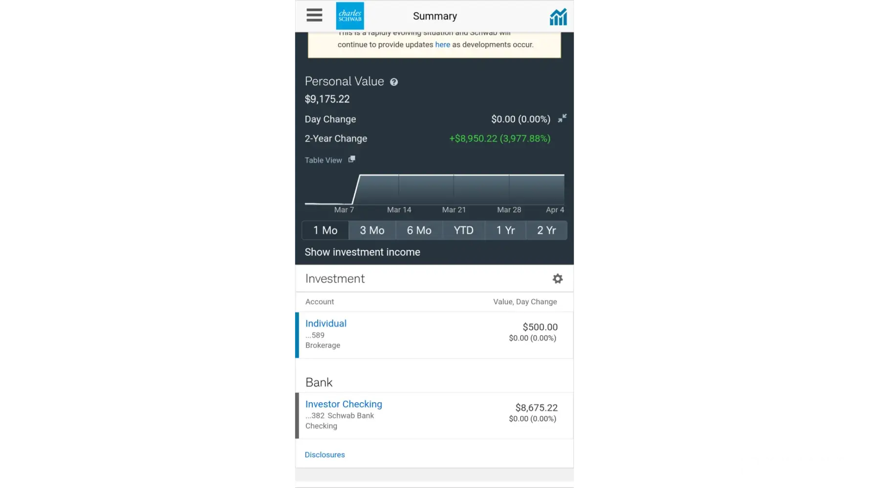 Schwab contacted me, challenged my review and asked me to relook at it. It is a friggin’ disaster. A formerly useful app is now made of screens which are 90% white space. There is NO WAY to do the basic functions such as looking at your holdings as a list and seeing how they’re doing.
