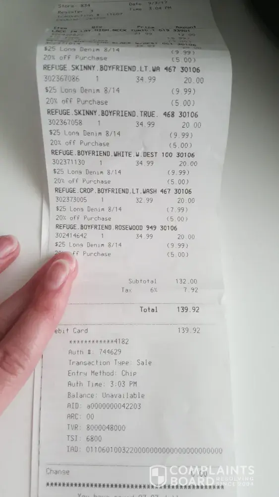 On September 3, 2017 at 3:04Pm store 834 transaction number 11607 in Coralville Iowa Mall I purchased over $100 worth of jeans. I was super excited because every single pair seemed to fit me perfectly. I got home and I washed them right away because I like to wash new clothes to get the store smell out of them. They said not to dry them so I did them on a gentle cycle and hung them up on a clothes rack. I let them dry for about a day and went to re try them back on to make sure they didn't lose their shape. To my disappointment, they are now about 4 sizes too big and I could probably fit another me inside of them. That's ridiculous, after only one wash they are completely ruined. I can't even keep them up with a belt. I would like to request a refund, and I can definitely send them all back to you considering I can't wear them anyways.