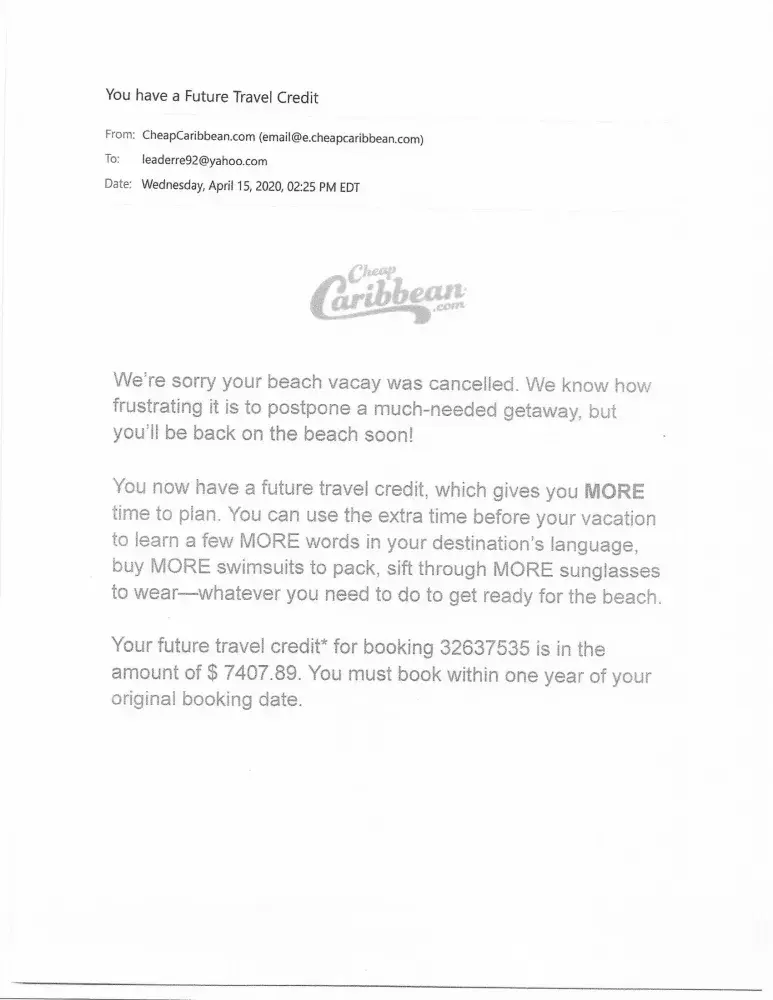 I have been in contact with Cheap Caribbean in numerous occasions without success. I would like to book a vacation from March 29-April 5th 2021 or within that period and within the same amount to be able to use the credits with the company. This is the only time I can go since it's when my son is off of school.