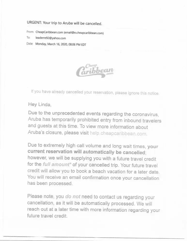 Cheap Caribbean A vacation I paid for to Aruba that was cancelled due to the Covid-19 pandemic.
