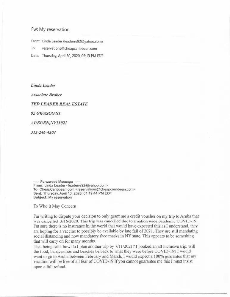 My vacation was cancelled due to the Covid-19 pandemic, I asked for my money back, they have refused. I hav envolved my credit card company in this battle and havent recieved any solution as of yet. The company wants to issue me a voucher for the vacation to be used by next July. First of all the Aruba vacation was all inclusive, in the future there will be no more all you can eat buffets, will there be social distancing and wearing face masks on beaches and in all restarants? No matter this will never be the vacation I paid for! As I write this complaint the USA isnt allowed to travel to many countries as our outbreak continues to climb. No one knows when it will be safe to travel again. I along with my husband are both senior citizens with health conditions, I am a type one diabetic and my husband is a 6 month cancer survivor with a compromised immune system due to radiation treatments.Thus our reasons for wanting a full refund. I have attached all communications that i have had with Cheap Carribean.