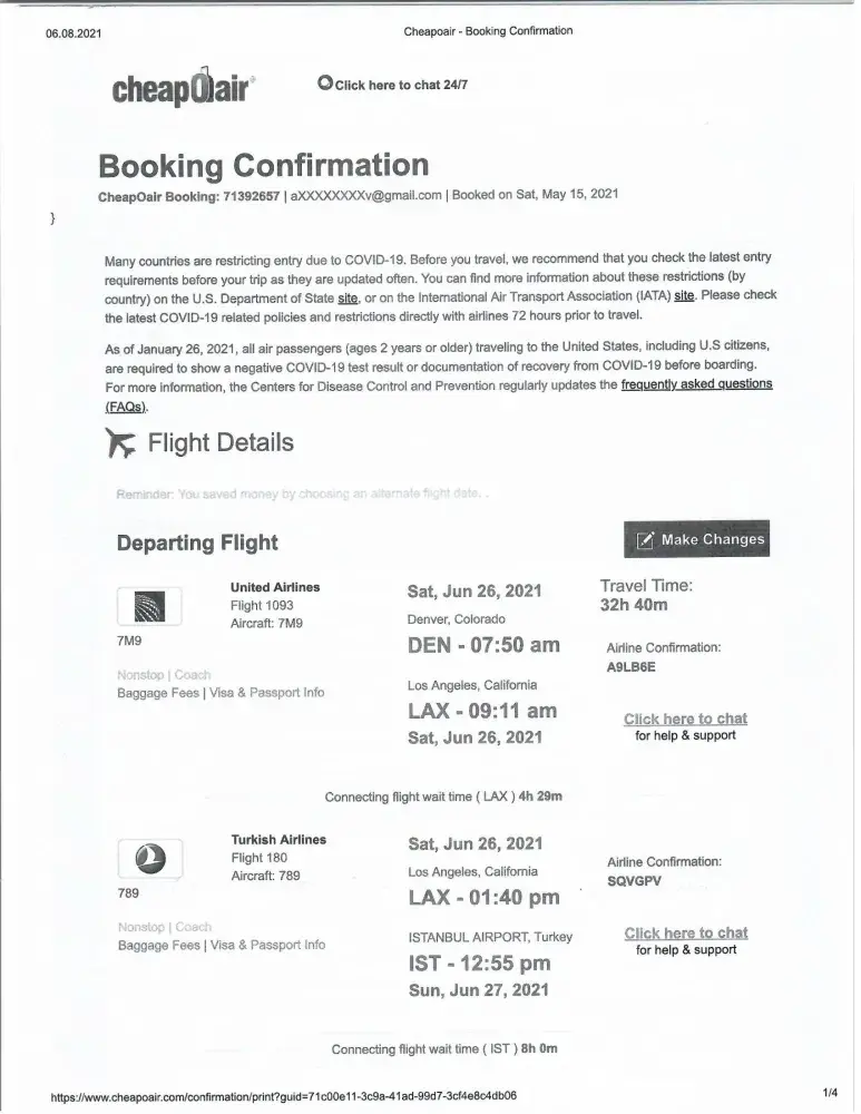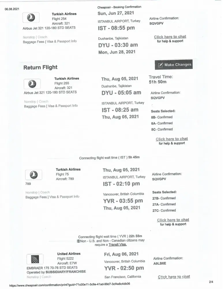 I purchased our round trip tickets from Cheapoair booking number [protected] and on 26 of June 2021 flew from Denver, Colorado U.S.A to Dushanbe, Tajikistan. According to our booking we had to fly back to USA on August 5, 2021.