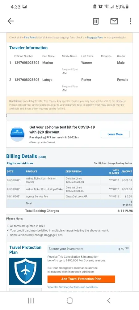 I am filing a formal complain regarding mine and my son's flight reservation through CheapoAir. As I indicated to every CheapoAir and Delta staff I spoke to - this was not a vacation! We were on our way to see my mother, Ines Marcolongo, who lives in Abano Terme, Padova. She is 91 years old and alone! Because of the pandemic travel restrictions, we missed both her 90th and 91st birthday (April 7, 1930). My father, her husband of 56 years, passed away so this visit was also my last-ditch effort to convince her to return to the United States since she is now completely alone! A refund of our tickets is the least CheapoAir could do for us! I am completely devastated because now we may not be able to see her again for yet another year due to the new Delta Variant. Moreover, I am terrified she may not live another year because of her health status and her depression due to a year in solitude from lockdown! She has fallen on multiple occasions. She has called me while I am at the hospital here in the U.S. for my internship in Respiratory Therapy because she's spilled boiling tea on her lap. But she refuses to get help because of Covid. The main strategy was to help convince her to come home so I can take care of her here!