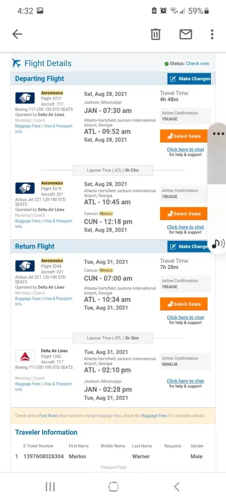The evening prior to departure, Sunday August 8th, I received an email indicating that our seats are no longer valid. This time, both my son and I are calling CheapoAir simultaneously trying to get a hold of an agent to find out what happening now! And once again, I am either put on hold indefinitely or I am hung up on. My son could not get anyone on the phone but I did manage to reach two different agents who explained that the airline had to be changed but assured me that there would be no problem. The first agent told me to call Delta to get the new airline confirmation number because he did not have anything on record for Delta. I called Delta and the Delta agent said that they could not do anything without the airline confirmation number which needs to be supplied by the travel agency. After several more calls, I reached the second agent and she reassured me that this was still the correct airline confirmation number and that we will have no trouble boarding the plane. I reiterated to her that I paid for our seat selection so we wouldn't have to worry for problems like this. She stated that I will have to secure the seats again at check-in. She reimbursed me the $21.90 and assured me once again that we will have no problems with the flight, and to make sure we go directly to Delta Airlines for check in.