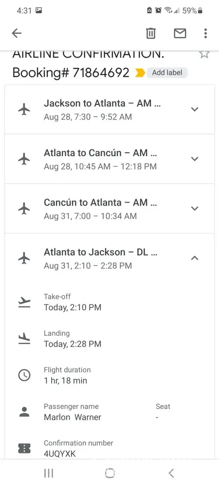 I wasn't given a reservation number or correct confirmation number for boarding my return flight. The agents hung up 3 times on me when asked about how could I receive info to get home from Atlanta, Georgia airport to Jackson, Ms airport. I even allowed the agents (Cheapoair) to speak with Delta airlines staff agents. Delta barely was able to help out after 4hours later. Delta told Cheapoair told my return flight time was delayed a few minutes but not canceled. Cheapoair didn't call back as promised. I missed my 2:25 flight home and Delta had to change my flight somehow to 6:11pm instead of 2:25pm the time my flight should of been.