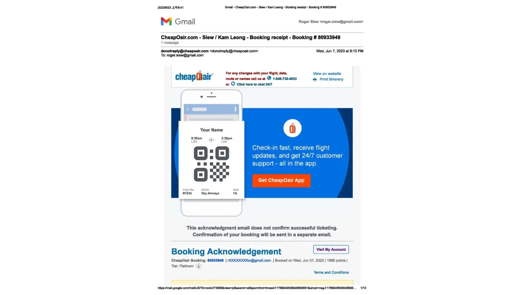CheapOair They charged client for a ticket without sending a confirmation of flight by e-mail