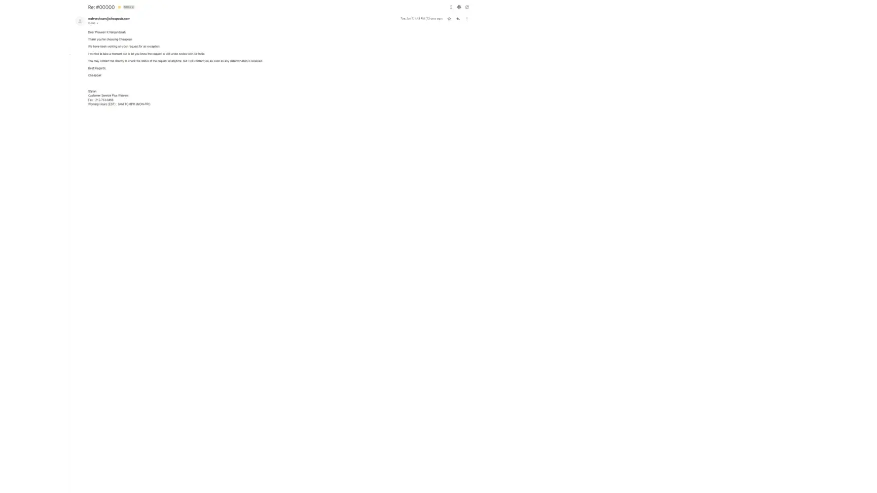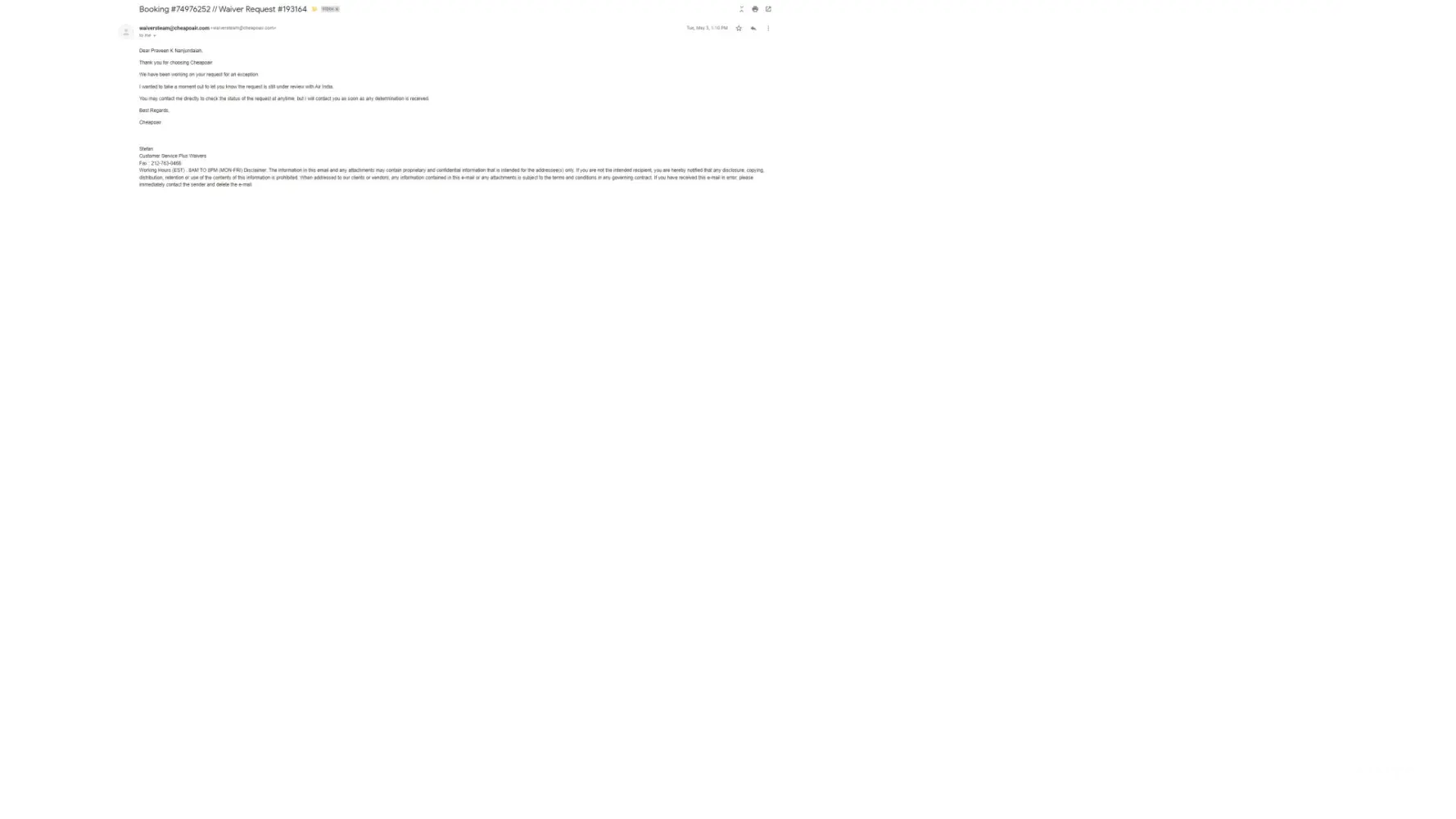 Below are the snapshots of the mails i received from Mr Stefan(cheapoair waivers team)