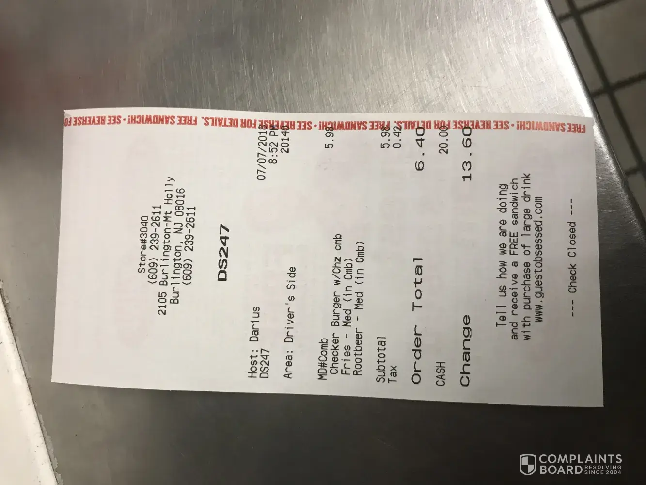 I went through the drive thru of a Checker restaurant, located at 3709-25 North Broad Street, Philadelphia, PA 19140 on Tuesday July 3, 2018. The all around service was shameful. My car and the car in front of me waited in the drive thru for approx 15-20 minutes. While waiting I observed staff ( more than 1) going out to a car that they had sitting In the other drive thru lane. They spent s few minutes by the car while we waited. When it was finally my turn to be serviced (I made my purchase using debit) The young lady was unable to give me a receipt, so instead she took a picture of the register screen with her cell phone (That was unreadable because of a cracked screen) i have never witnessed a thing it is a business and that is how you conduct business. WE SPENT A TOTAL OF 28 MINUTES in the drive through with only one car in front of us. WORST SERVICE EVER this gives CHECKERS a bad name. If I had to rate 1-10(10 being the worst) the service I received today it would be -10