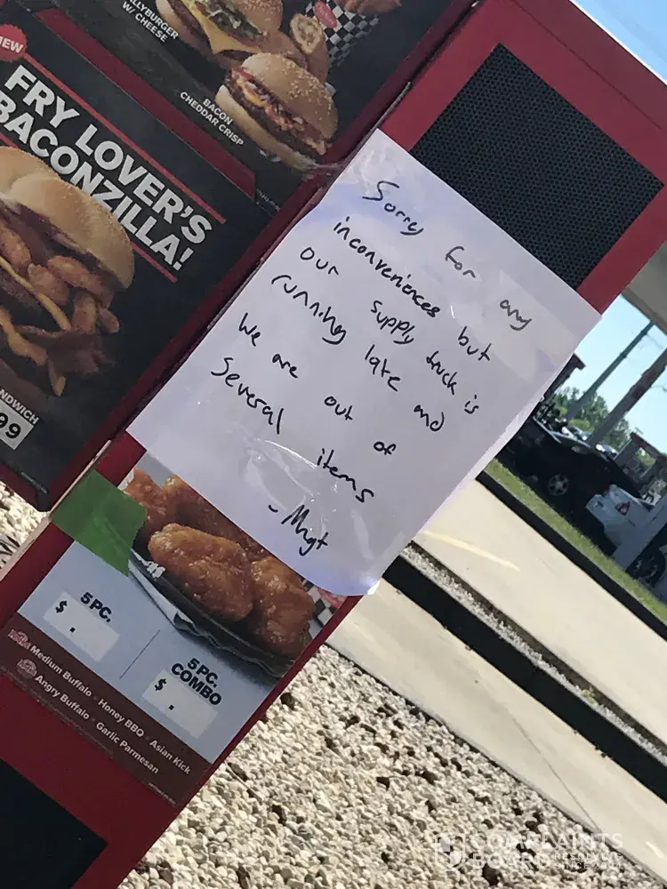 You lost orders from four paying customers, who were in fact, ordering much more than four burgers. I work in customer service and never would my company treat a consumer in such a way! Besides the fact of denying my coupon which clearly states what it was for, there was a handwritten sign on the drive thru saying they were out of several items as their supply truck had not yet arrived.