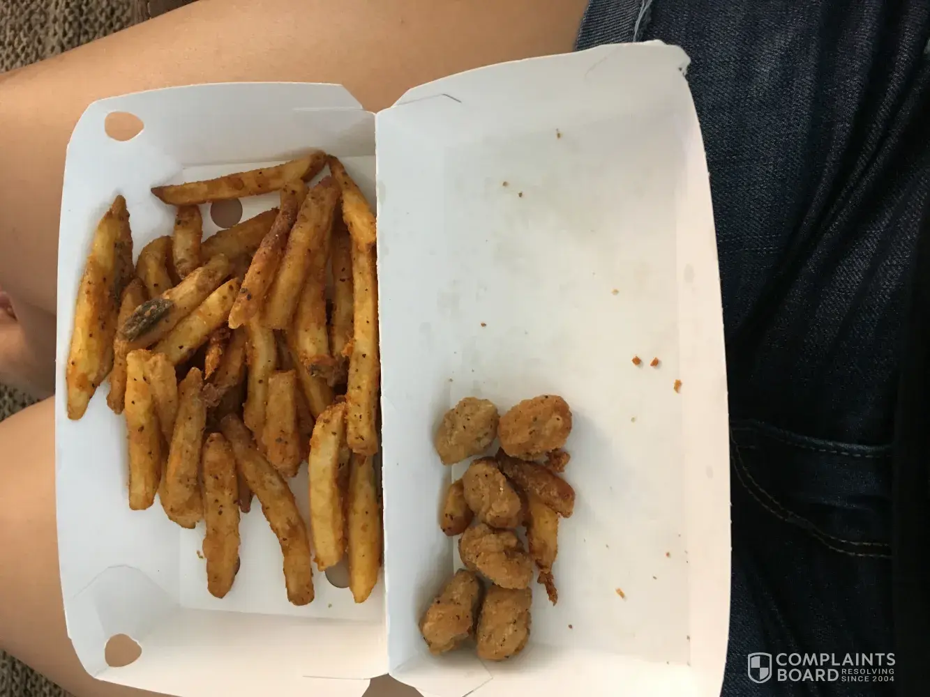 I drive myself all the way down to checkers and find myself ordering a chicken bites box. So, chicken bites and some fries is what I expected, right? I check the bag to make sure my order is right, and I drive home. After getting home I open the box and start to separate the fries and the chicken bites they decided to put into the same box. All done. End of it all, I see myself with nearly triple the amount of fries than chicken bites. About 7 chicken bites in the entire box. What is this Checkers!? I was the only one in line!