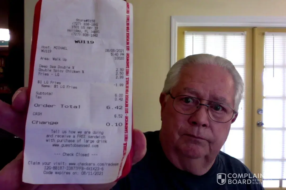 Since I moved to retire in Florida, in 2007, Checkers has been my go to for fast food. On an average I visit your drive thru at least once a week. Rarely will I go anywhere but here and when driving out of state, Checkers has been my welcome home gift. Quality/quantity, price, and service ruled every time.