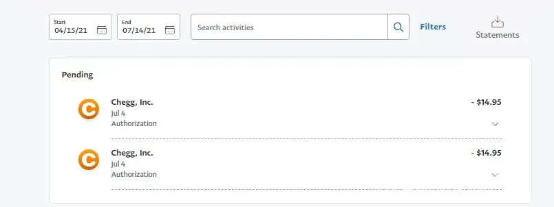 Chegg.com has charged my visa card in April and now in May 2021. I called my credit card company and they are investigating the case. The did credit my april money back to me, May is still pending.