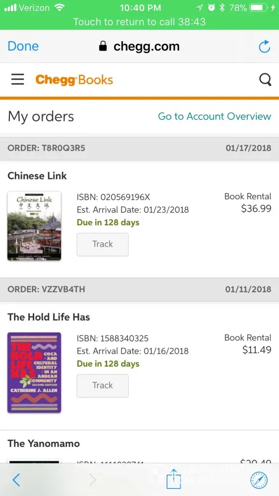 I ordered my textbooks off of Chegg before the semester began. So this would have been January 22, 2017. It is now February 21, 2017 and my books are still not here. I have called USPS and I have called Chegg customer service and no one is helping me. I have emailed and left complaints and no one will fix the problem. Someone needs to find my books and send them to me ASAP. I am 4 weeks without my textbooks and I am really struggling without them. I paid for these books to get here around January 30. The fact that they are still not here is unacceptable. Someone needs to send me new books, or give me my money back... preferably both because this is not okay.